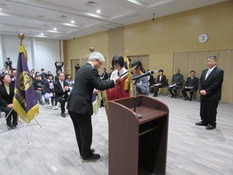 11月5日(水)、砂川市役所の大会議室において、市内全小中学校による「6校合同校旗返納式」が行われました。各学校からは、校長先生、代表児童生徒2名、引率教員の計24名が出席し、来賓、招待者等を含め、総勢84名が参加しました。
