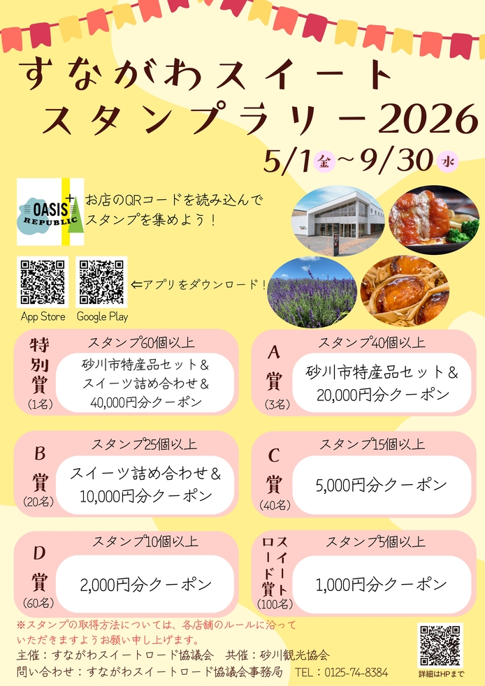 ・特別賞(スタンプ60個以上)→砂川市特産品セット&スイーツ詰め合わせ&40,000円分クーポン 1名様