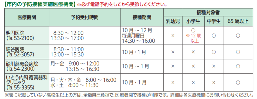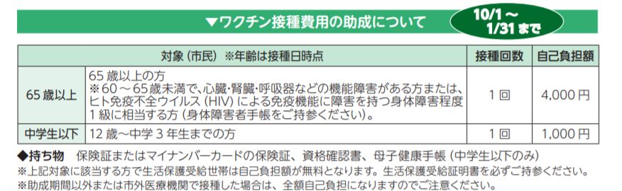※助成の対象者であっても、助成期間以外に接種された場合や市外医療機関で個別に接種した場合の接種費用は全額自己負担になりますので、ご注意ください。