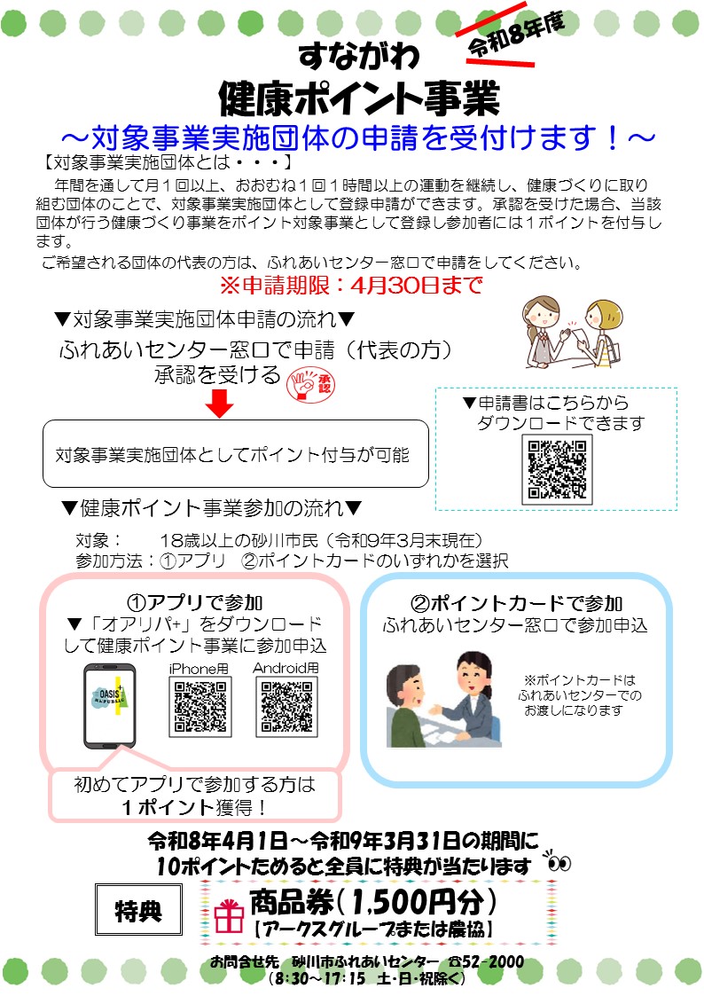すながわ健康ポイント事業 事業対象団体の申請を受け付けます!