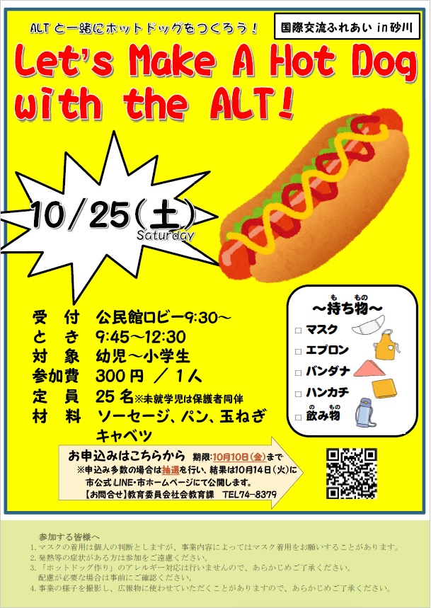 ALTの先生と英語のレシピを読みながらホットドッグを作ってみんなで食べましょう!英語を使って遊ぶ交流タイムもあります!ぜひご参加ください!