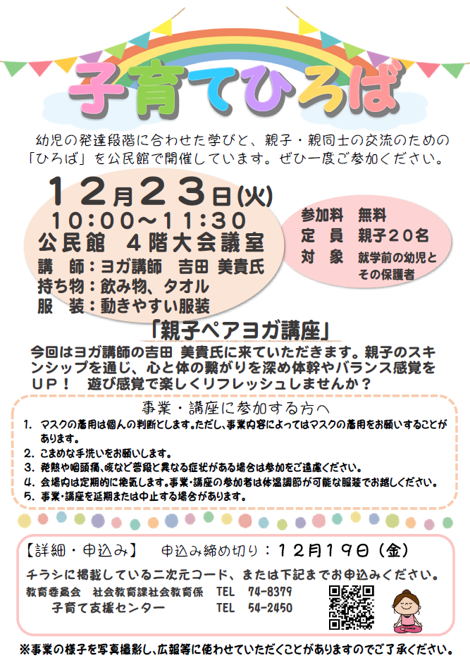 )または下記の連絡先まで申込みください。 - 連絡先 社会教育課 ℡74-8379 子育て支援センター ℡54-2450
