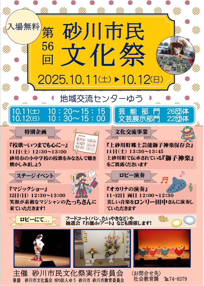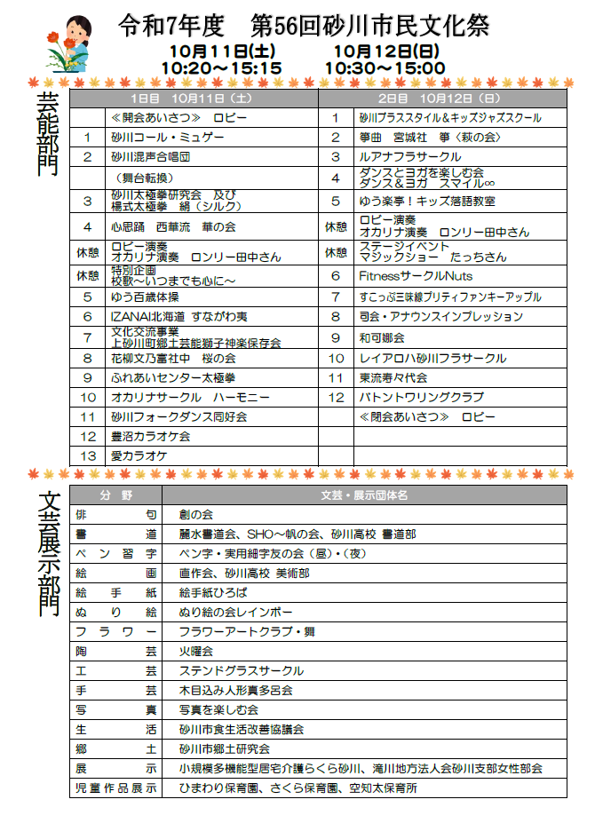 - 問合せ 砂川市民文化祭実行委員会事務局 ℡74-8379(社会教育課)