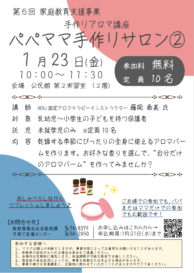 パパママ手作りサロン②(手作りアロマ講座)開催のお知らせ