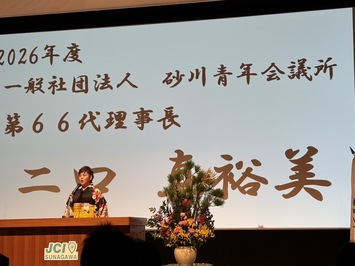 今年度の理事長は第66代の二口真裕美理事長。砂川青年会議所初の女性理事長です。