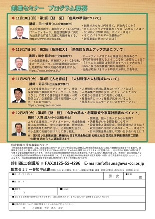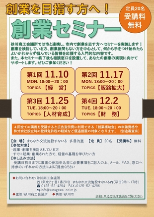 砂川商工会議所と砂川市が連携して、砂川市内で創業を目指す方への支援を強化しており、平成29年度より創業希望者を対象に創業セミナーを実施しています。創業して間もない方はもちろん、経営の基礎について学び直したい方の参加も可能です。「将来創業したいと思っているが、何から準備したらよいかわからない」、「すでに創業しているが、経営やマーケティング等の基礎知識を一から学びたい」といった方のご参加をお待ちしております。
