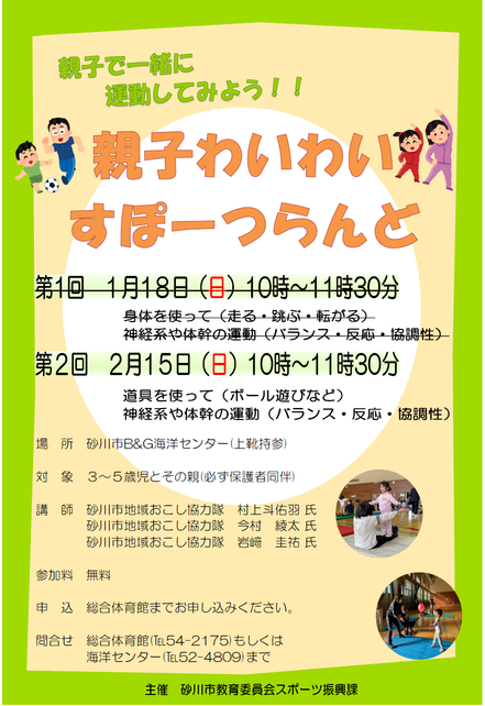 - 申込 砂川市総合体育館(TEL:0125-54-2175)へ申込みください。