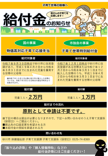 令和7年12月1日時点で砂川市に住民登録がある世帯または令和7年12月2日から令和8年3月31日までに転入した世帯のうち、平成19年4月2日から令和8年3月31日までに生まれた児童を養育する世帯の児童手当受給者等
