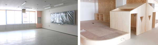 ①サブアリーナの内装工事の状況です。木質系の壁を貼り始めています。