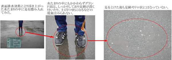 今回採用しているグランド排水工法は特殊クレイ舗装というものになります。水はけの悪いグラウンドとの比較資料では雨上がりでも表面が泥状になりにくい工法となっています。