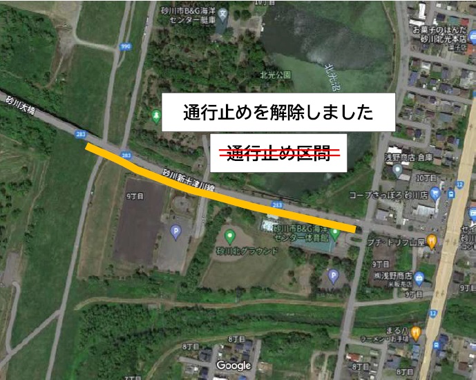 冬期間より通行止めを行っていた道道砂川新十津川線にて隣接している海洋センター沿いの歩道については、3月31日に通行止めを解除いたしましたのでお知らせいたします。
